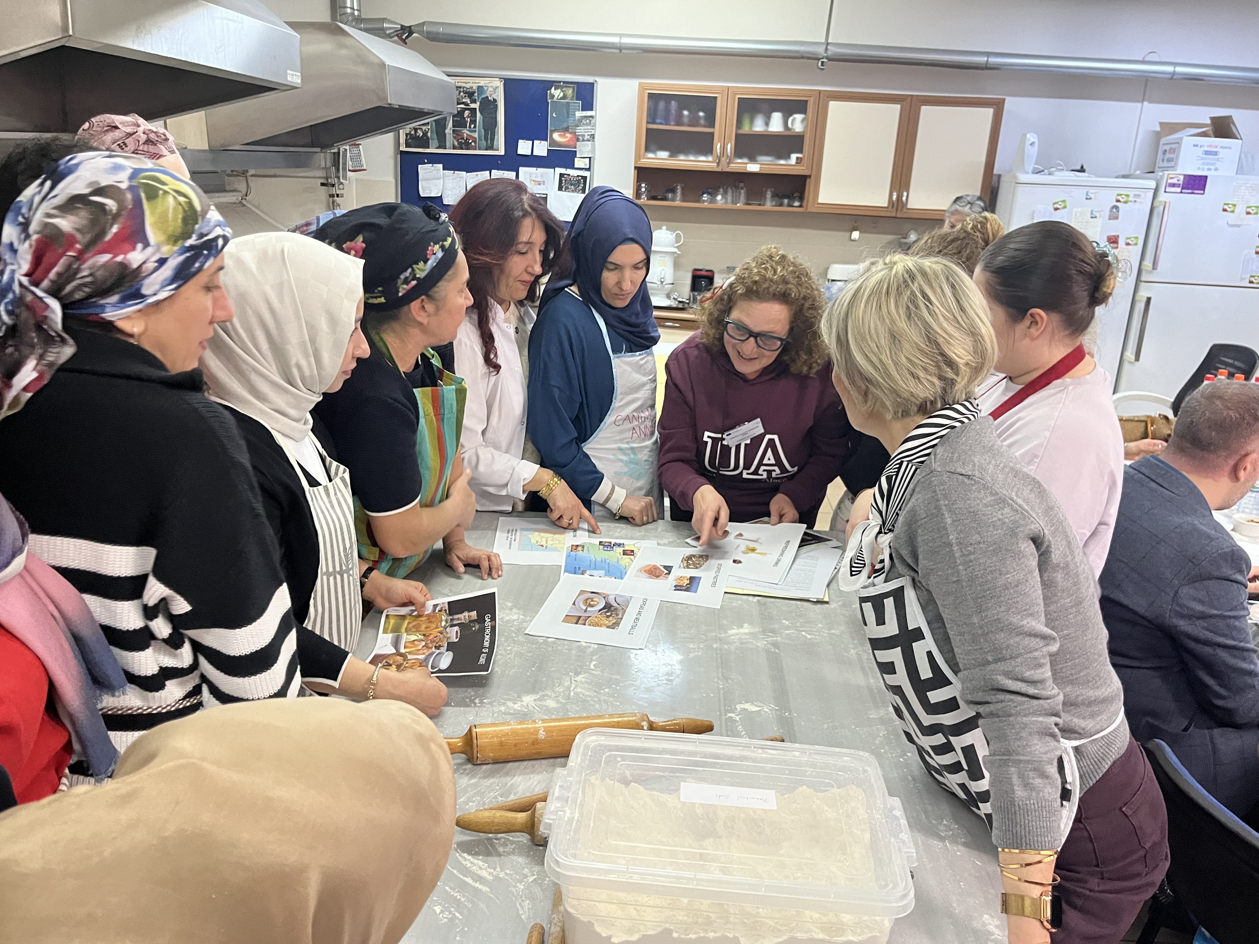 Cooking students, led by Mrs. Neslihan Kurtulnuş, invited us to learn how they prepare çi börek, a kind of fried dumpling stuffed with minced meat. We were then treated to this delicious dish and a typical Bursa dessert, kemalpasa, accompanied, of course, by tea. Kindness, friendliness and good food - what more could you ask for?
